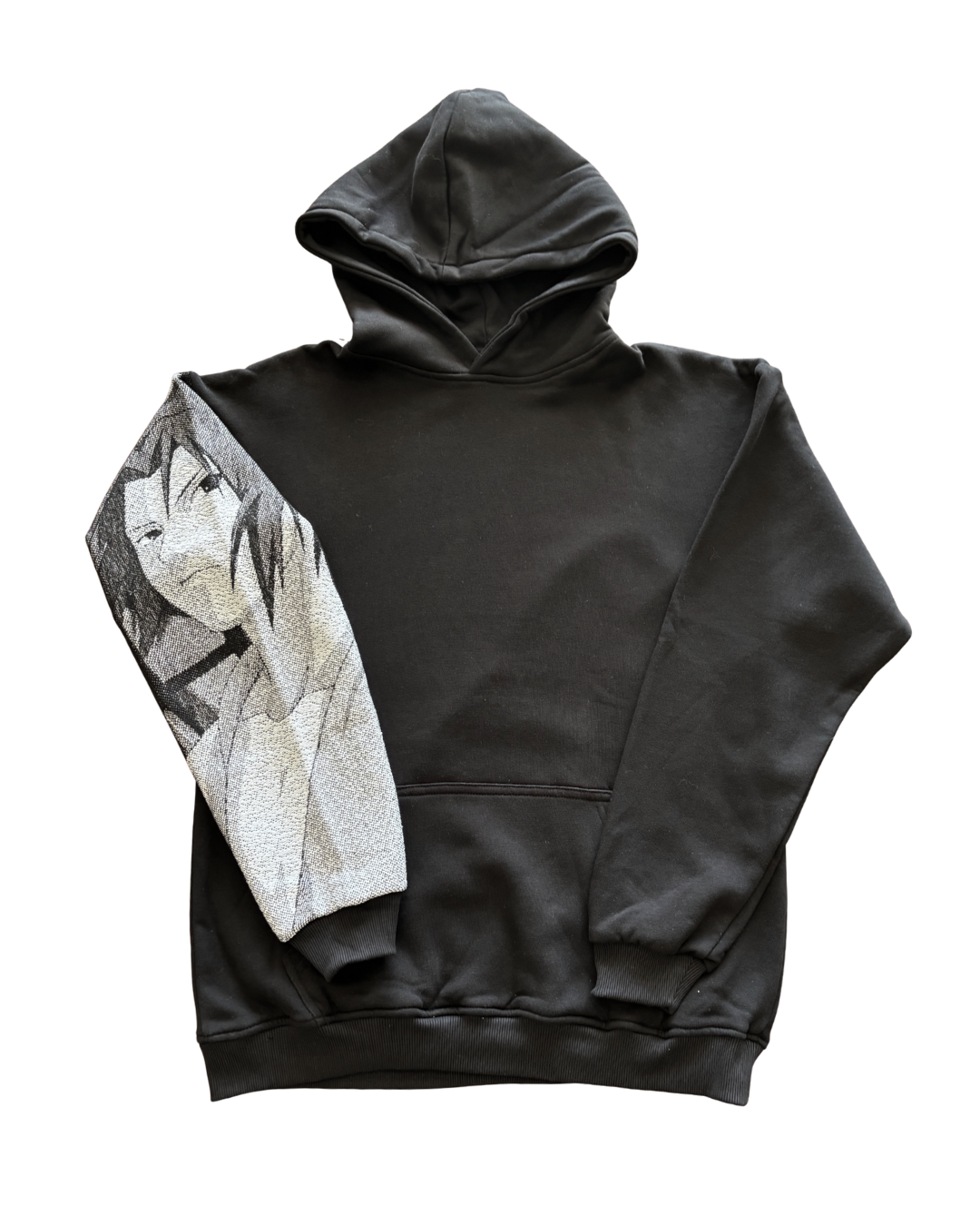 Felpa 100% cotone "made in Italy" con cappuccio nera. Dettaglio personalizzato in tessuto 100% cotone cucito a mano con immagine di Sasuke dell'anime Naruto. Tascone frontale.