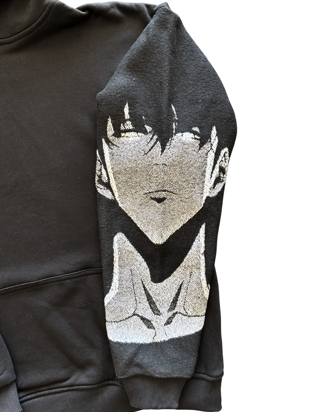 Felpa 100% cotone "made in Italy" con cappuccio nera. Dettaglio personalizzato in tessuto 100% cotone cucito a mano con immagine di Sung Jin-woo, Solo leveling. Tascone frontale.
