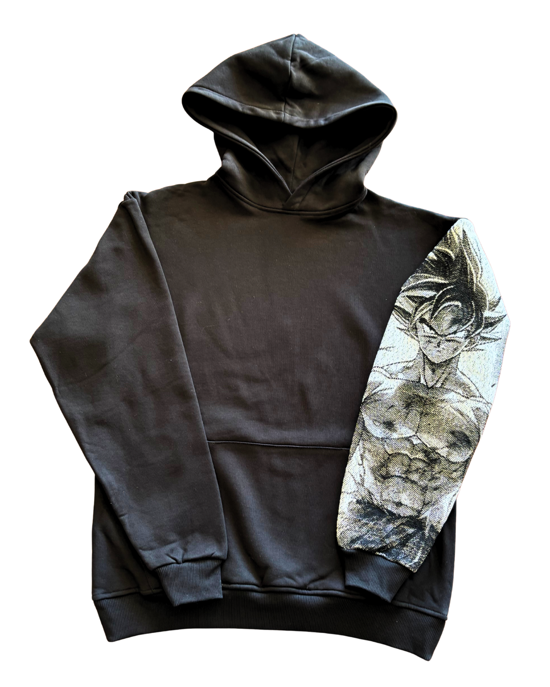 Felpa 100% cotone "made in Italy" con cappuccio nera. Dettaglio personalizzato in tessuto 100% cotone cucito a mano con immagine di Goku, Dragon Ball. Tascone frontale.