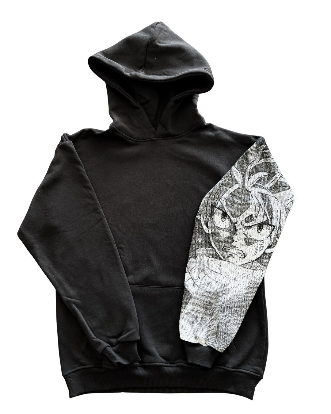 Felpa 100% cotone "made in Italy" con cappuccio nera. Dettaglio personalizzato in tessuto 100% cotone cucito a mano con immagine di Natsu Dragonil, Fairy Tail. Tascone frontale.
