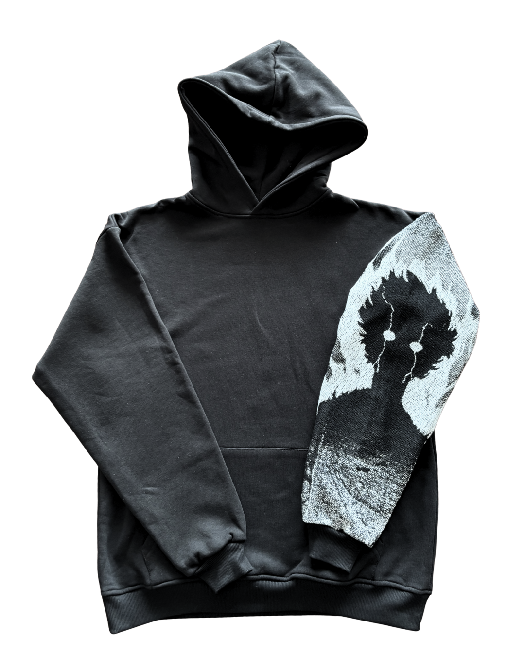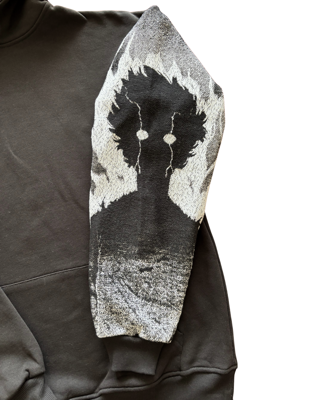 Felpa 100% cotone "made in Italy" con cappuccio nera. Dettaglio personalizzato in tessuto 100% cotone cucito a mano con immagine di Shigeo Kageyama, Mob Psycho 100. Tascone frontale.