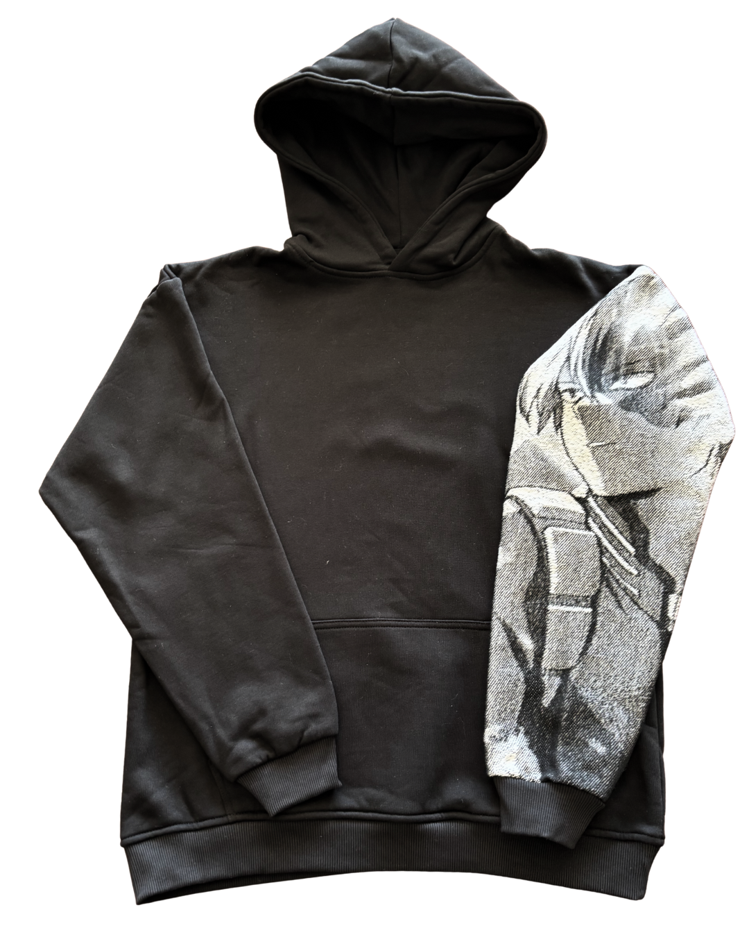 Felpa 100% cotone "made in Italy" con cappuccio nera. Dettaglio personalizzato in tessuto 100% cotone cucito a mano con immagine di Shoto Todoroki, my hero academia. Tascone frontale.