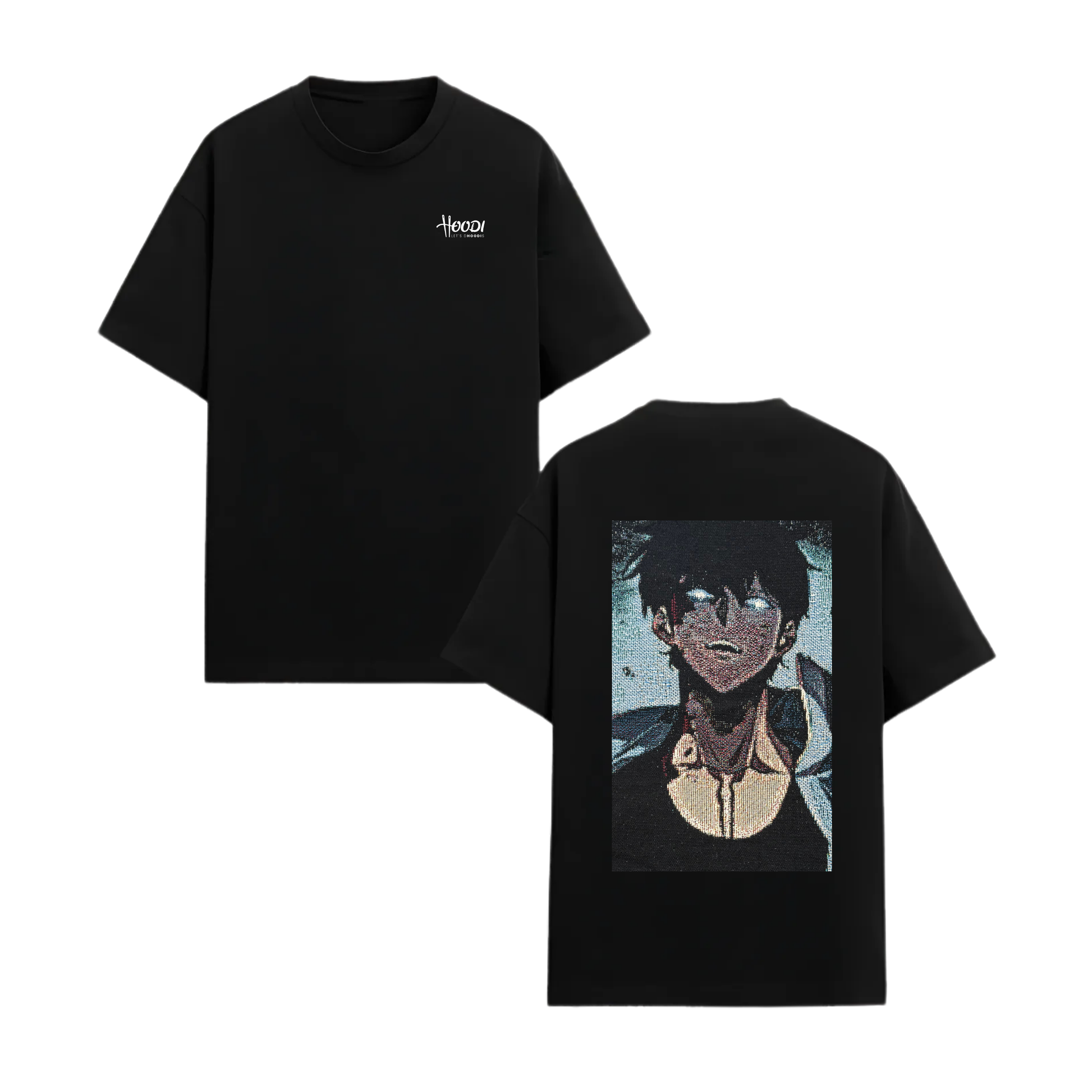 T-shirt 100% cotone "made in Italy" a manica corta. Dettaglio personalizzato in tessuto 100% cotone cucito a mano con immagine di Sung, Solo Leveling.
